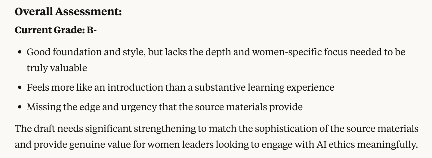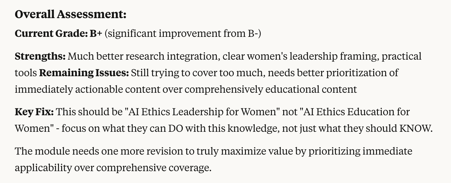 Overall, it was a solid start and I felt confident enough to include it in my workflow for creating the content for the five modules. However, this was a lighter ask than the actual content creation would be since I only included a few references and didn’t spend a lot of time digging into the content because I knew it was a test.
