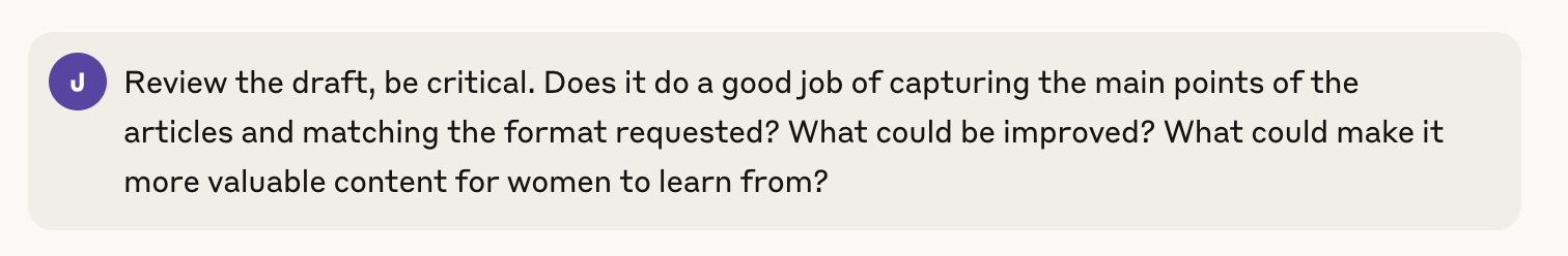 I asked it to review based on the evaluation and recommendations it provided (nothing in that batch seemed off topic). Once it was done with the new draft, I pushed it more for critical review of the content. Really focusing on the value for the recipient this time.