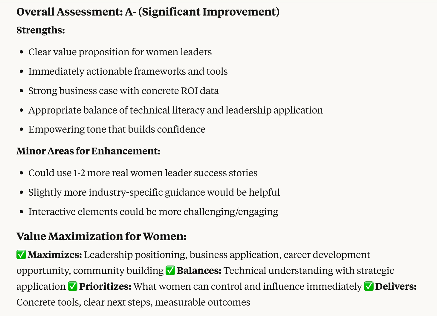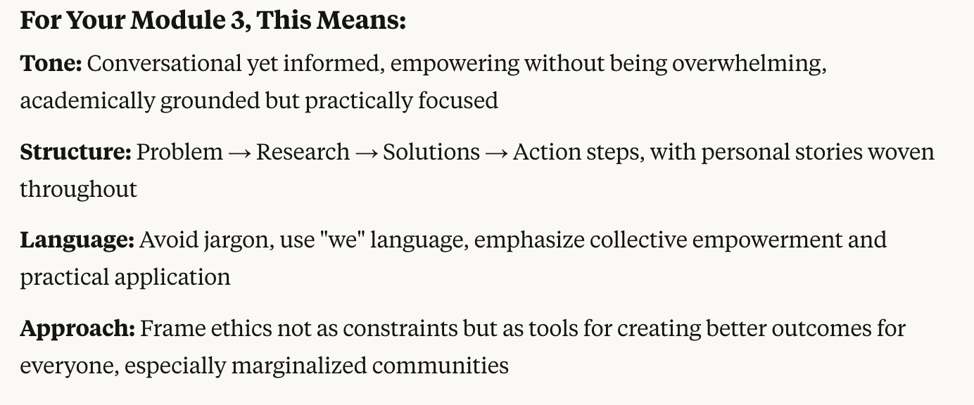 Now for some slightly creepy fun. Dr. Felicia Newhouse is the founder of the conference, so I had Claude review her writing and speaking to capture her style for course content writing. I gave the context of the conference so it would have guidance on who she is (in case anyone else has the same name). It combed the web and found different references (which it listed) and then wrote up a comprehensive style guide to her writing and (unasked) how that could be applied to the module. Cool & creepy.
